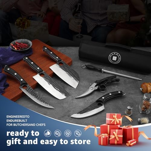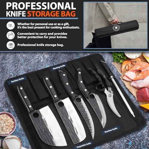 Enhance your culinary experience with the Tivoli Professional Butcher Knife Set. This multi-functional collection includes essential knives: a Nakiri vegetable knife, Serbian chef’s knife, fillet knife, boning knife, along with a professional sharpening rod and a sharp pair of poultry shears. Whether you’re slicing, dicing, or deboning meats and fish, this versatile set is perfect for both home cooking and professional kitchens.