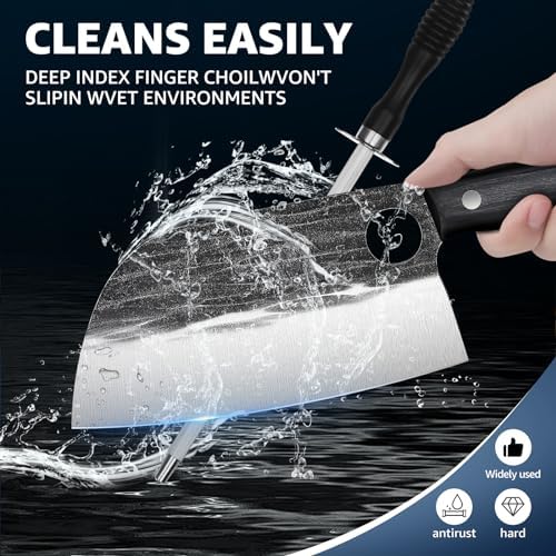 Experience the ease of cooking with our chef knife set featuring hand-polished blades with a sharp 15 to 17-degree angle. These blades glide seamlessly through various ingredients, making meal preparation quick and efficient. The stylish hammered finish and black coating not only enhance their aesthetic appeal but also minimize sticking, ensuring clean cuts every time.