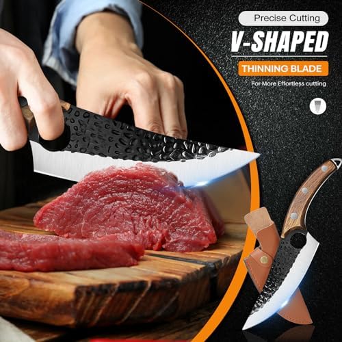 Included with the outdoor chef knife is a practical soft leather sheath that protects the blade and enables easy carrying. You can attach it to your belt, making it an indispensable companion for butchering, fishing, camping, and outdoor BBQ activities.